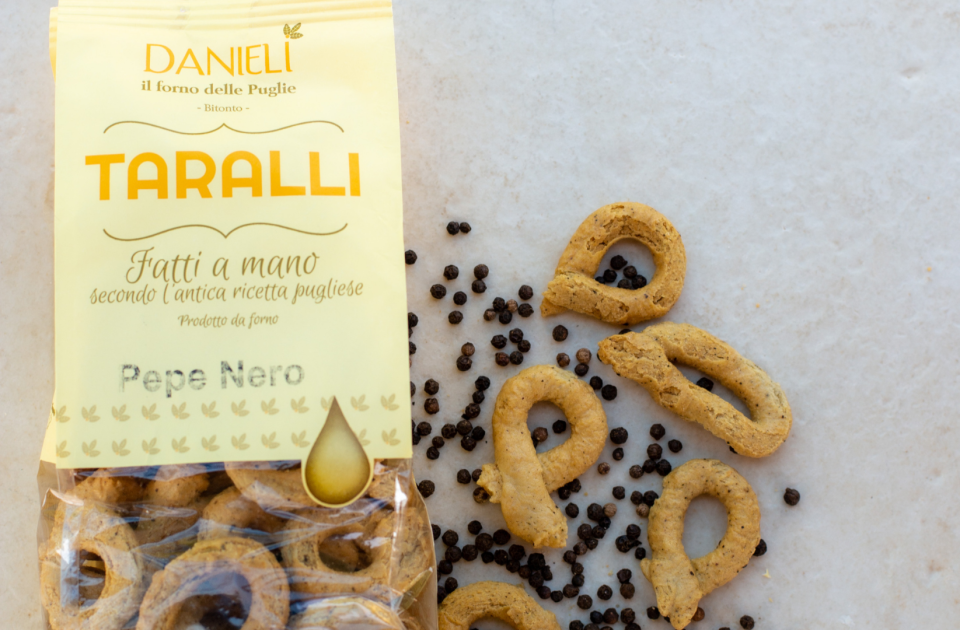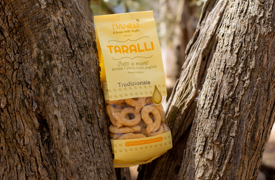 I taralli Danieli sono gustosissimi ma soprattutto friabilissimi snack, questo grazie all’utilizzo di materie prime come la farina proveniente dal tavoliere di Puglia o come l’olio extravergine di oliva, vanto delle terre di Puglia, ed evitando accuratamente l’utilizzo di conservanti.