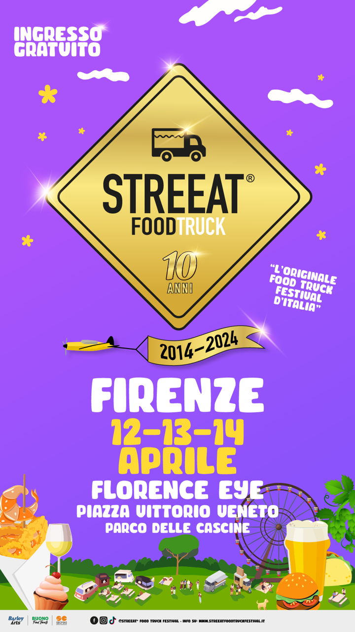 Da 10 anni il Food Truck Festival gira l’Italia con una carovana di colori, odori e sapori provenienti da ogni dove e porta nelle piazze i classici cibi di strada proposti da ape car, carretti, furgoncini, biciclette, roulotte, moto e rimorchi allestiti con piastre, forni, friggitrici e griglie roventi e non mancano ovviamente le birre artigianali. Dal 12 al 14 aprile saranno a Firenze, al Parco delle Cascine in Piazza Vittorio Veneto sotto la Ruota Panoramica. Tra le proposte gli arrosticini di pecora, il pesce fritto, gli hamburger di Chianina o di Black Angus e poi ancora nacos e pita gyros. Per finire in dolcezza crepes, donuts, muffin e torte.
